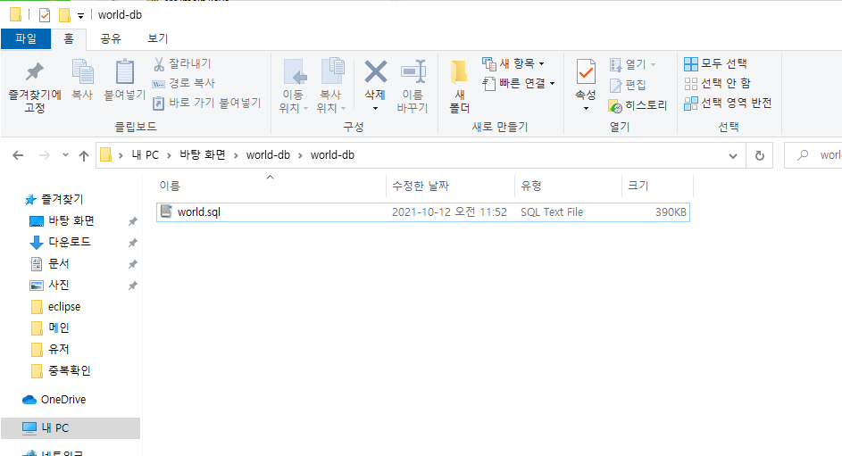 다운로드 받은 ZIP파일 압출을 풀면 world.sql 파일이 나온다.